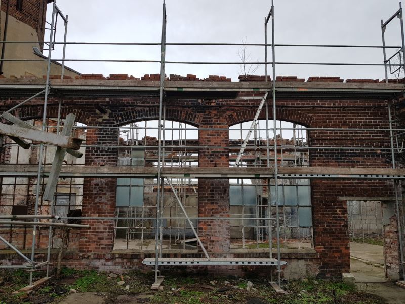 Und zum Schluss noch zu den Arbeiten am Lokschuppen I. Endlich wurde das Baugerüst aufgestellt, durch welches das Arbeiten an der Mauerkrone möglich wird. Da dort von oben Wasser eingedrungen ist, müssen die obersten Lagen entfernt und neu aufgemauert werden. Das wird zeitnah durch eine Fachfirma erledigt. Danach kommen die Dachdecker.