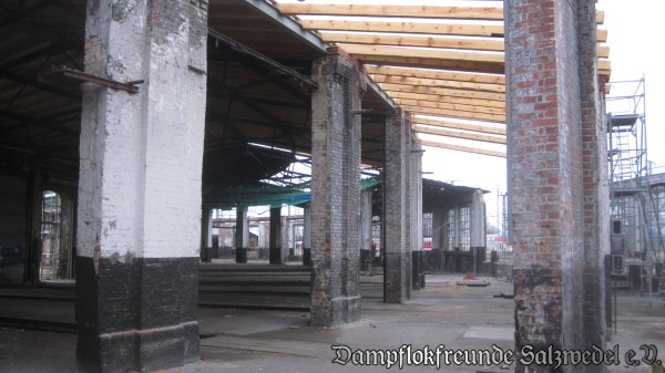 Seit der letzten Berichterstattung vor ungefähr vier Wochen hat sich einiges im Gelände des Bahnbetriebswerkes Wittenberge getan. Die Abbruchphase wurde abgeschlossen, der Aufbau hat begonnen. Zunächst fällt die weiter fortschreitende Dachdeckung auf.