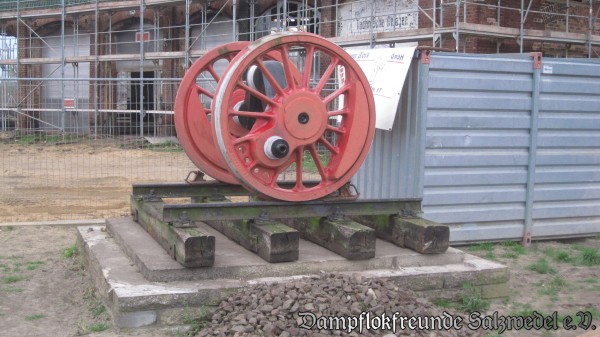 Nachdem der Podest an der Drehscheibe lange verwaist war, wurde dort inzwischen wieder eine Treibachse einer Dampflok der Baureihe 44 aufgestellt, die bislang eine Rasenfläche im Bw Salzwedel zierte. Das freut uns aus zwei Gründen: Erstens war das Bw Wittenberge lange Jahre Heimatdienststelle solcher Loks und die Achse erinnert nun an die Hochzeiten des Bahnbetriebswerk. Zweitens hat damit das erste schwere Exponat aus Salzwedel seinen zukünftigen Bestimmungsort erreicht.
