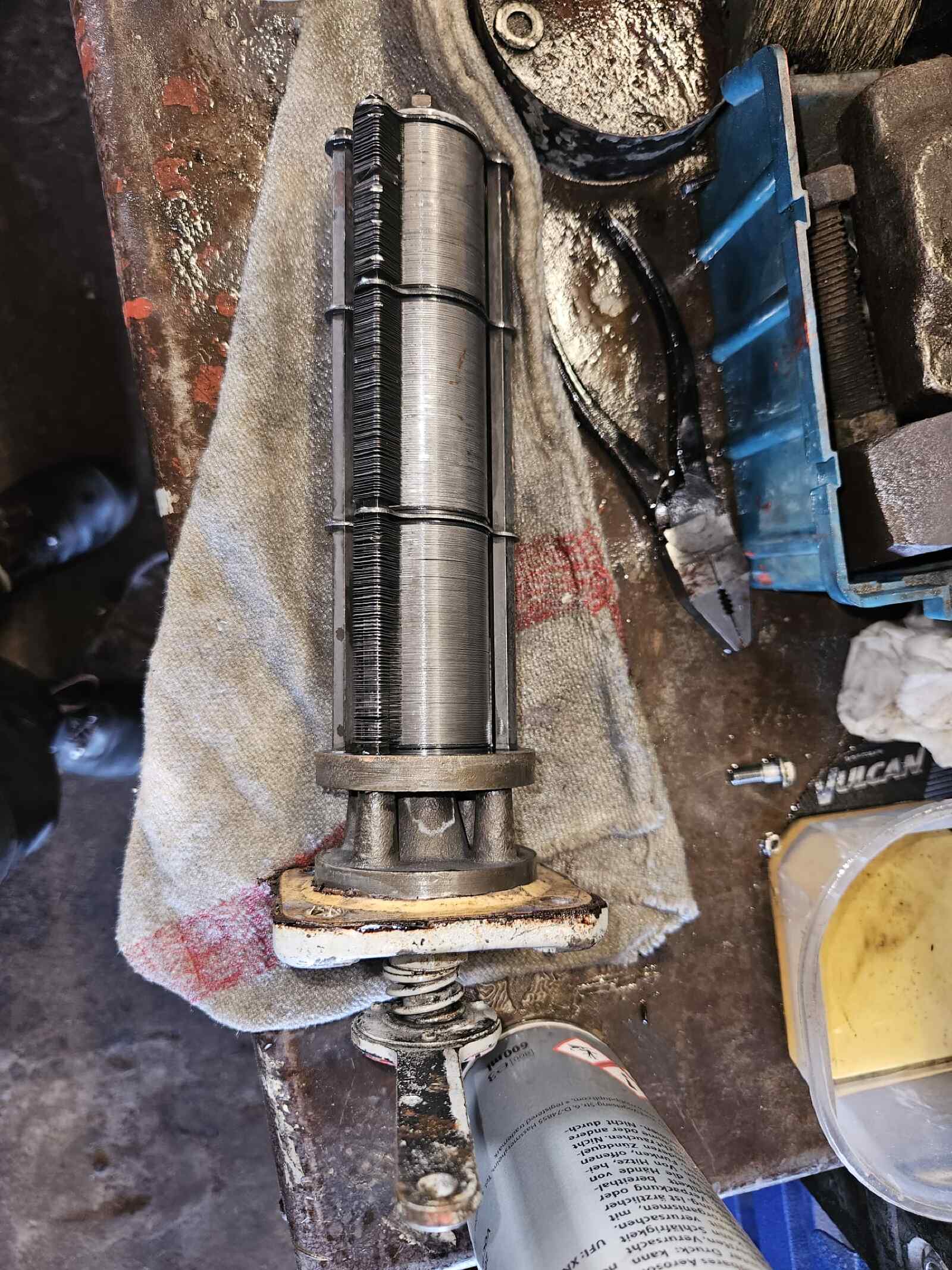 Auch an unserer Diesellok der Baureihe 114 wurde gearbeitet. Hier haben die Kollegen den sogenannten Spaltfilter gereinigt. Das ist eine Einrichtung, die metallische Verunreinigungen aus dem Motoröl filtert. So ein Spaltfilter besteht aus mehreren Hundert Lagen dünner Bleche, zwischen denen das Motoröl hindurchgedrückt wird und die die Verunreinigungen auffangen.