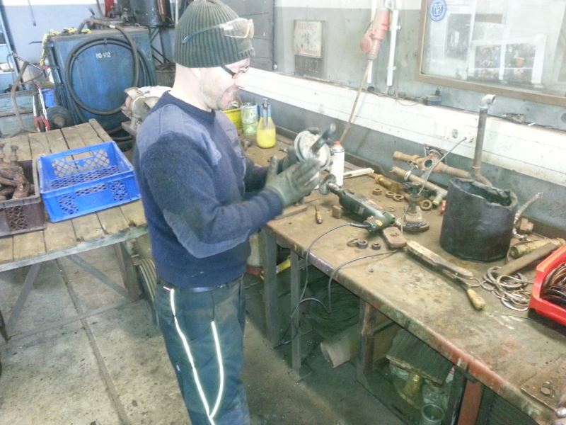 Ein Teil der Arbeiten bestand darin, das Kesselinnere von Kalkablagerungen, dem sogenannten "Kesselstein" zu befreien. Dazu wurden alle Waschluken ausgebaut und der Kessel gründlich gespült. Nun mussten eben jene rund 30 Waschluken aufgearbeitet und wieder eingesetzt werden. Dazu hatten sich heute zwei Kollegen um die Reinigung der Luken gekümmert, andere bauten sie in den Kessel ein.